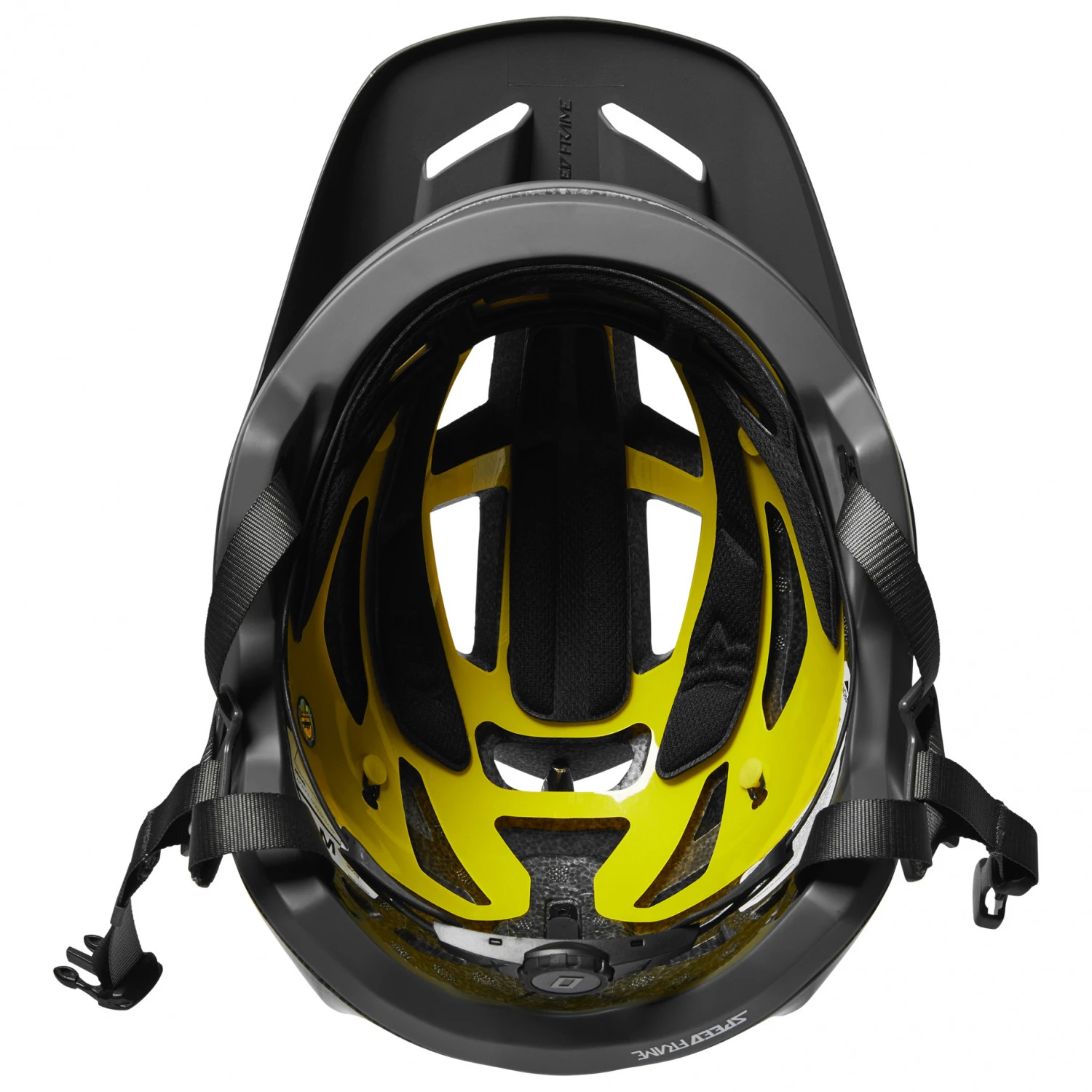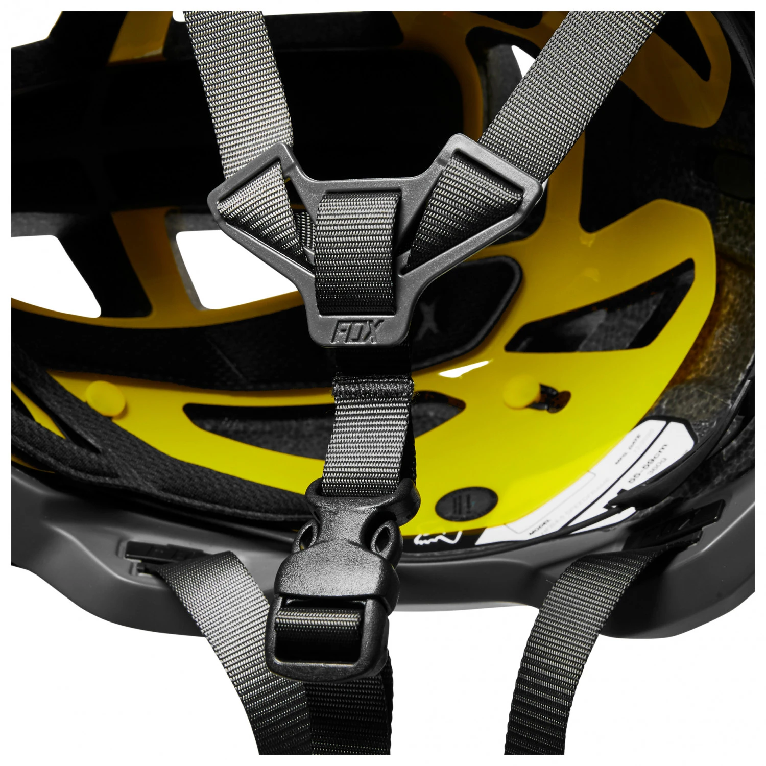 The Speedframe Camo cycling helmet from FOX Racing will catch your eye with its chic look and fits perfectly into a stylish biker outfit. To ensure that the helmet fits perfectly, whilst providing maximum protection, it’s equipped with a twist lock closure. In combination with its 360-degree system, this ensures an all-round excellent hold with optimum protection in case of a fall. Thanks to this system, even rotational impact forces are perfectly absorbed, thus reducing the chances of injury.